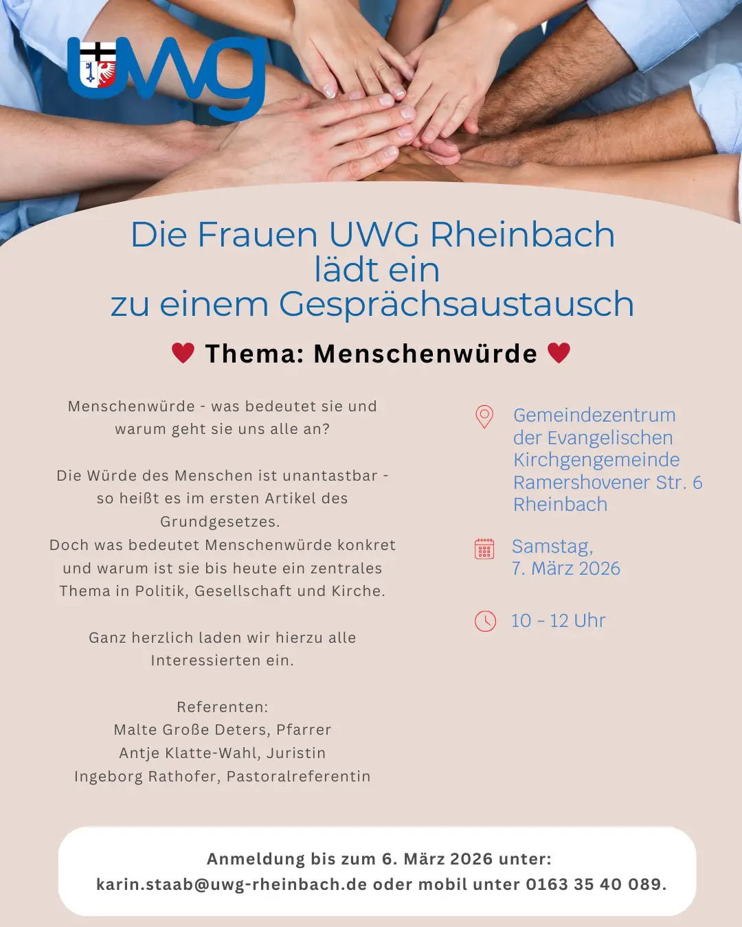 Die Frauen der UWG Rheinbach möchten diesem zentralen Wert unserer Demokratie Raum geben und laden herzlich zu einem offenen Gesprächsaustausch ein.